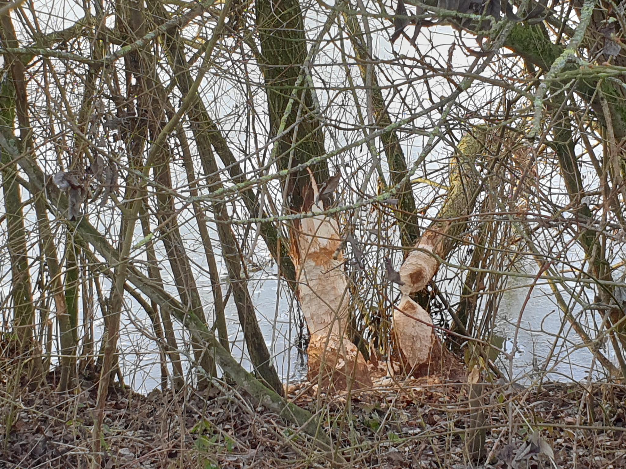 Am Feuchtbiotop vor dem Steingrauen Wäldchen hausen seit einigen Wochen Biber. Sie stauen den Bach, bauen auf den Inseln im Teich ihre Burgen und schwimmen unter dem Wasser zum Strand.